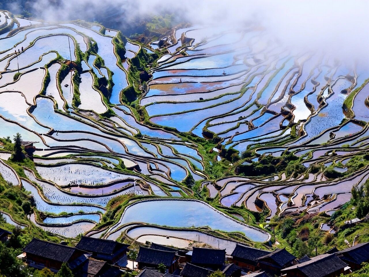 早起拍摄苗寨晨景,拍摄晨雾缭绕中的吊脚楼群、日出光线洒在寨子上的层次感;后前往加榜梯田,拍摄【党扭一号观景点】或【加页梯田】夕阳余晖下的金色梯田和水面反光。