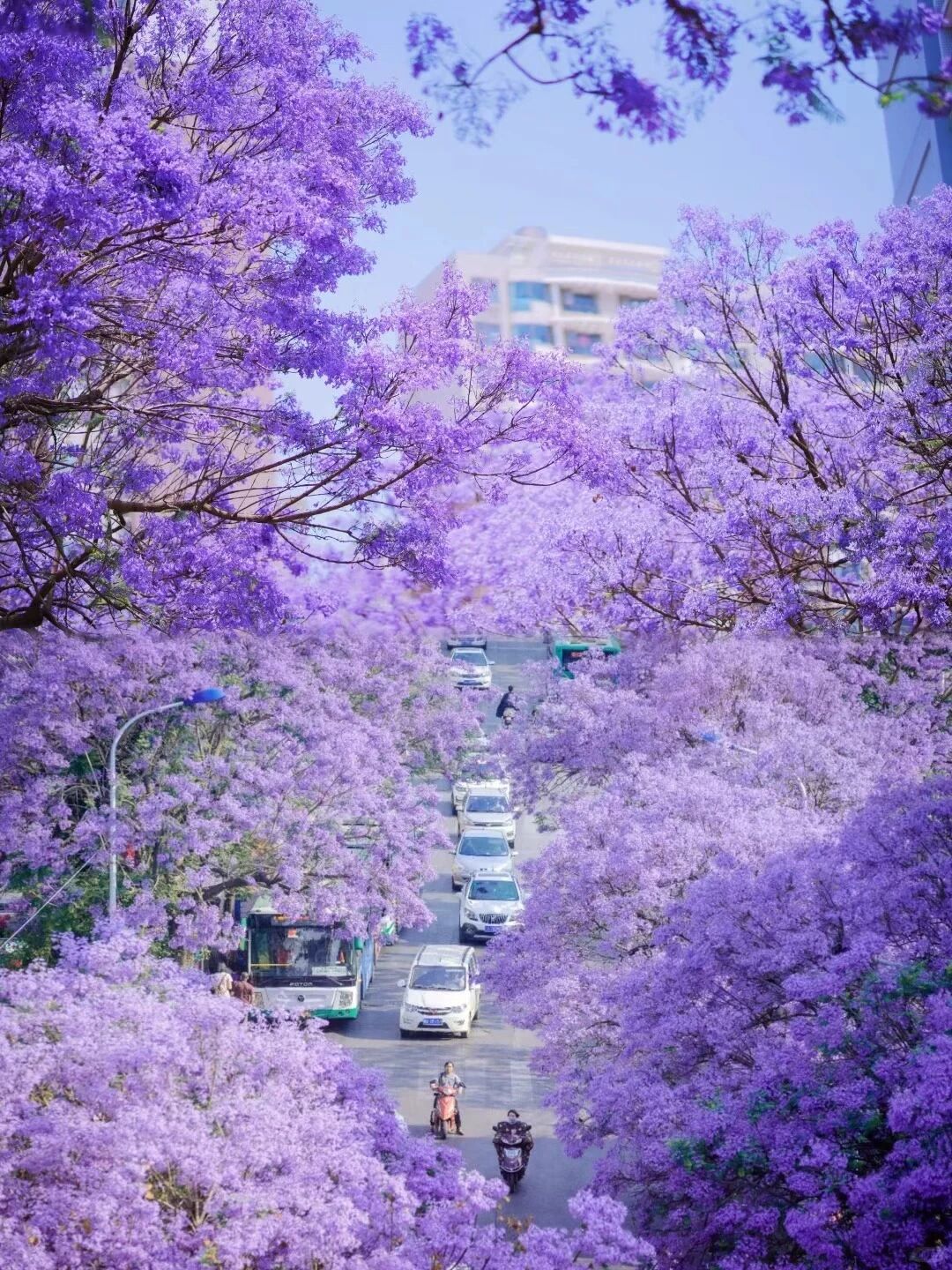 【全天拍攝不同場景的藍花楹】教場中路的紫色長廊、盤龍江畔的水影花姿、紅錦路的千株盛景等;